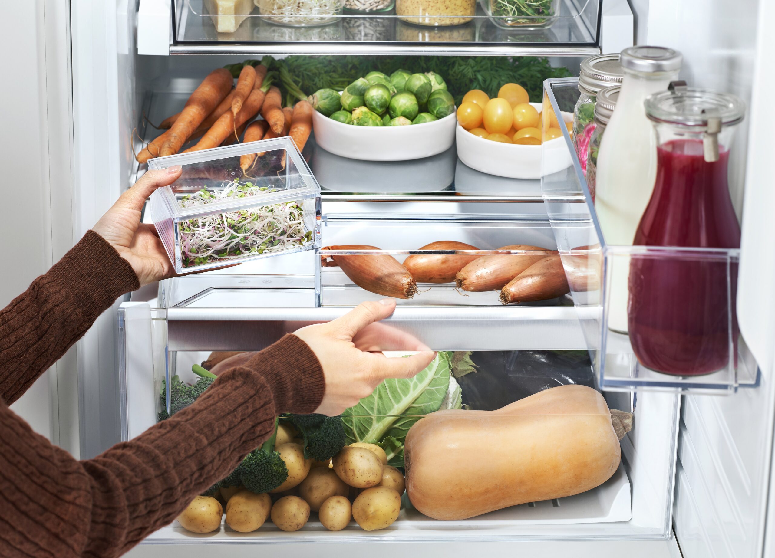 W chłodziarko-zamrażarce CustomFlex® 600 jest odpowiednie miejsce na każdy produkt. Przenośne pojemniki mocowane na drzwiach urządzenia można rozmieszczać zależnie od aktualnych potrzeb. Zmieści się w nich wszystko – od pędów szparagów po opakowania z borówkami.