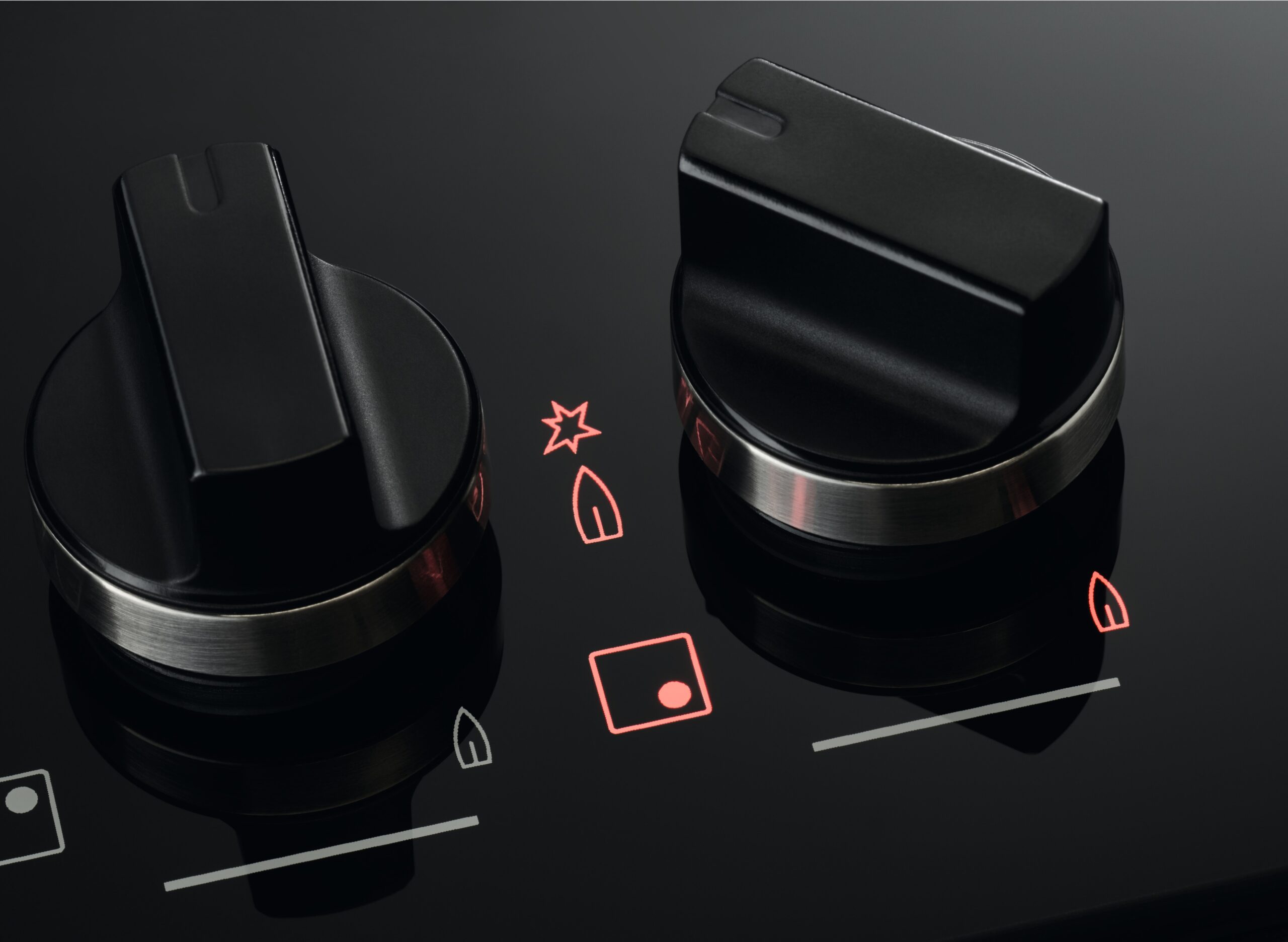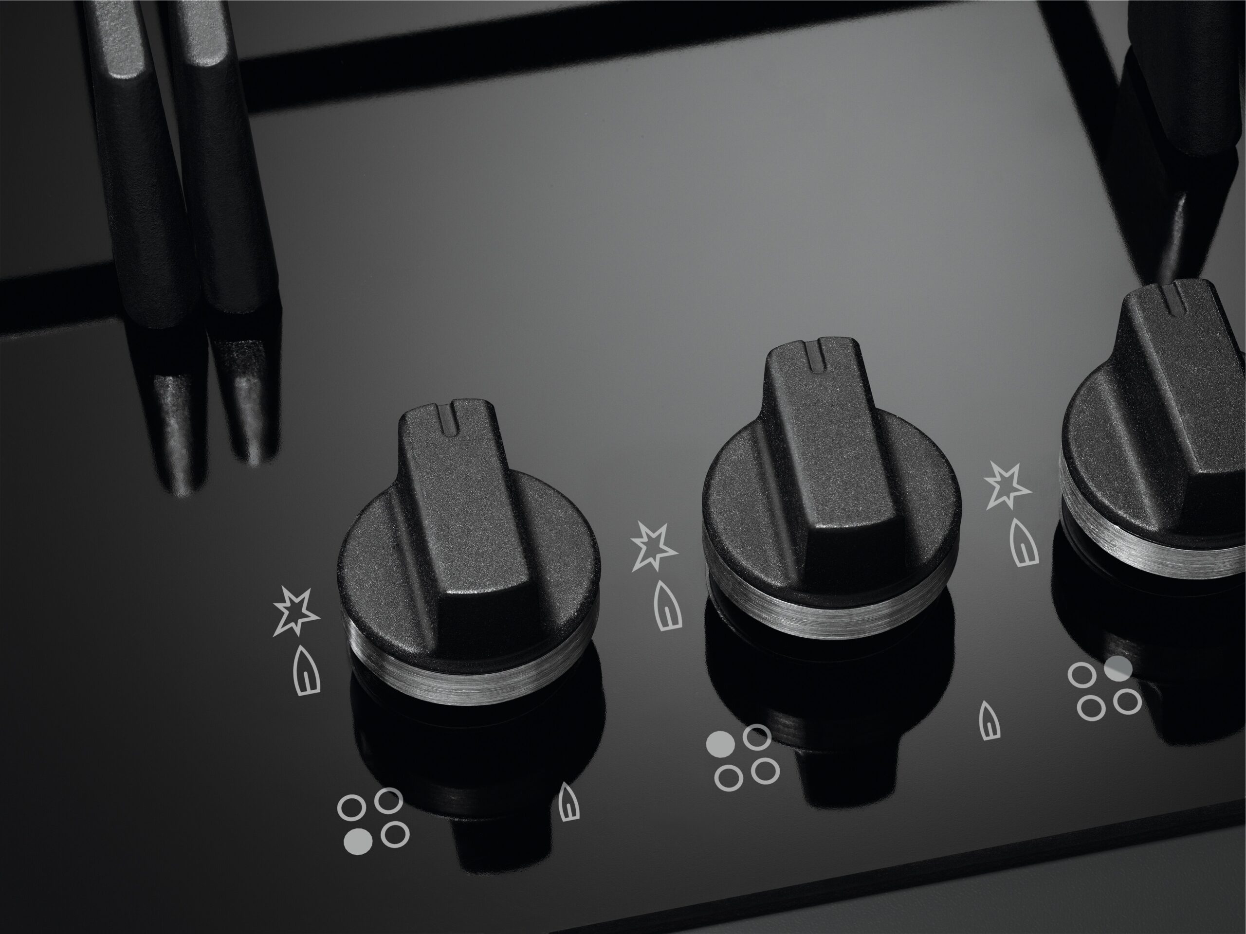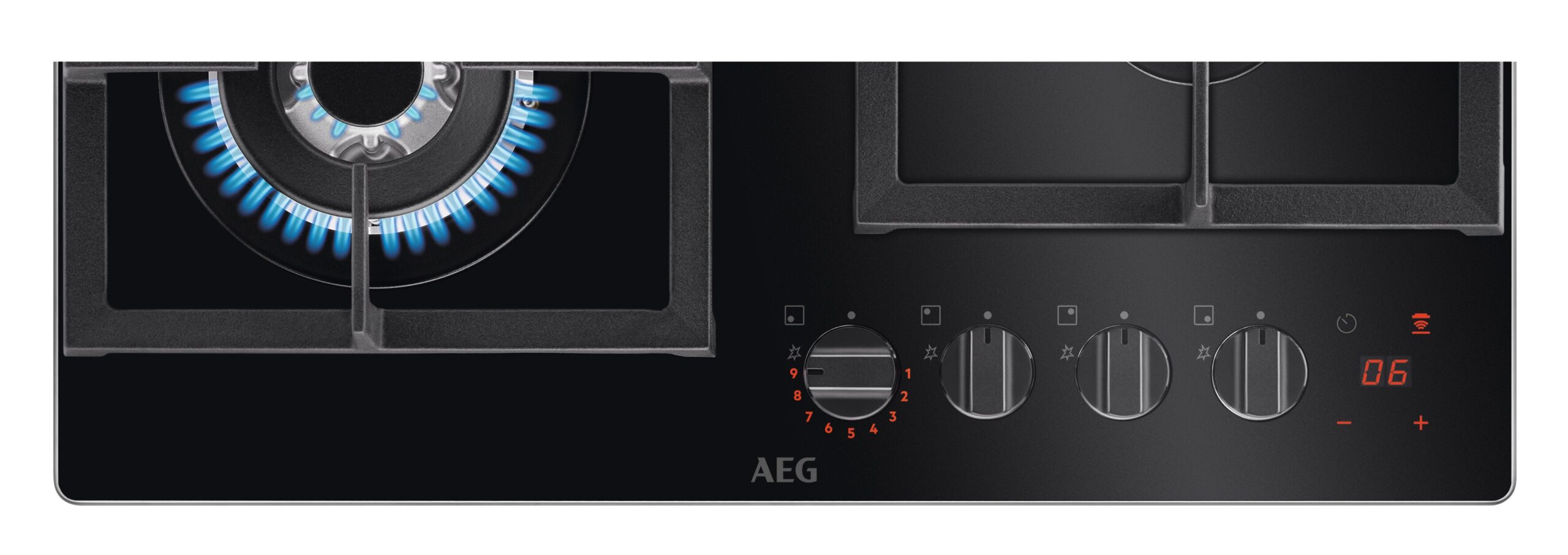 Jasne diody LED płyty gazowej FlameLight pokazują wielkość płomienia w zakresie od 1 do 9, dbając o komfort podczas gotowania. Żywe kolory diod LED przypominają o włączonych pokrętłach oraz informują, czy ruszty nad palnikami są jeszcze gorące.