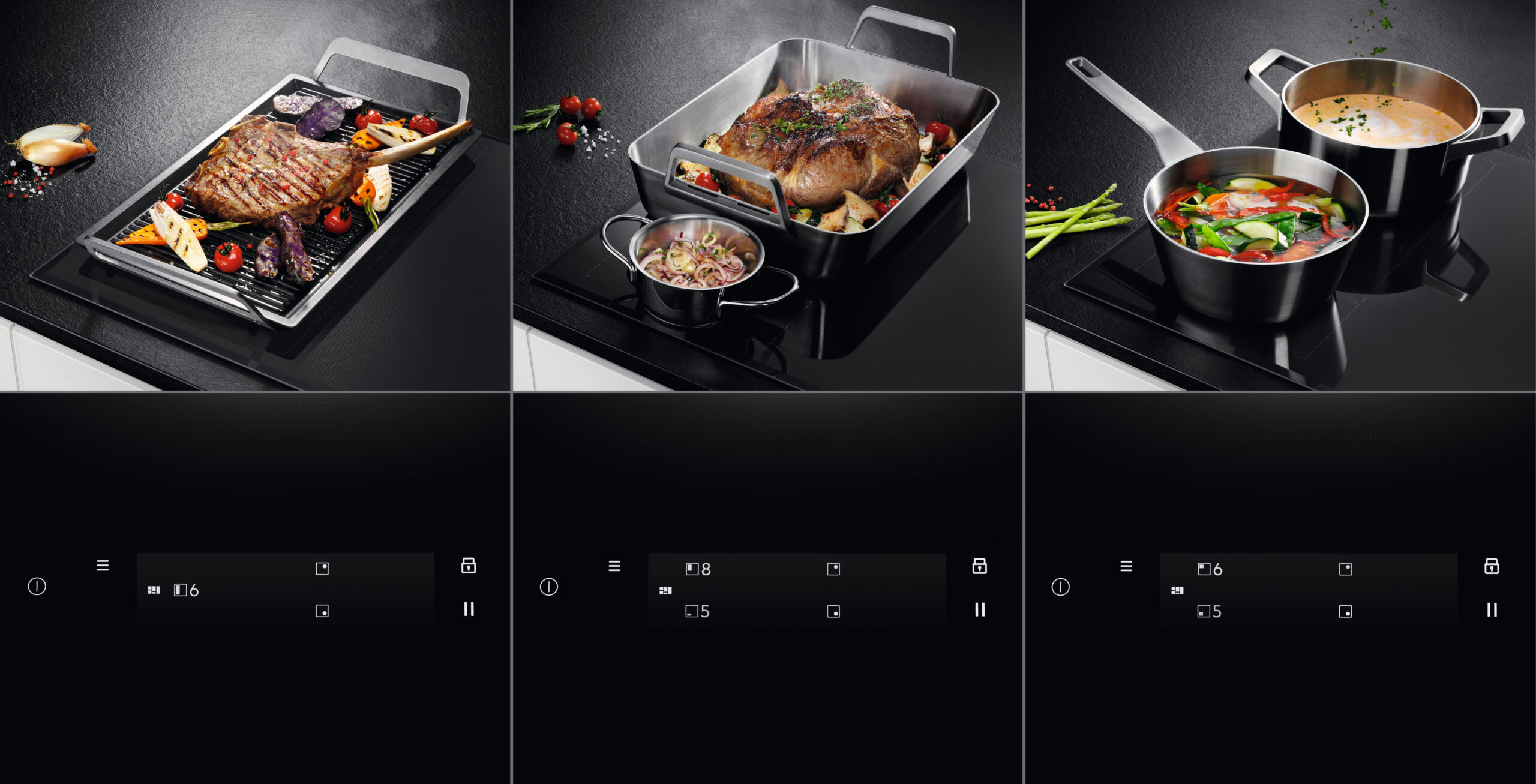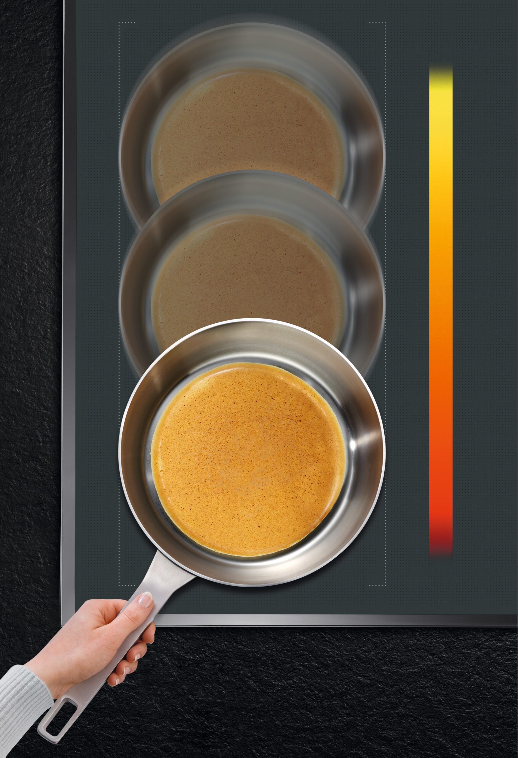 Płyta indukcyjna FlexiBridge z czterema oddzielnymi segmentami grzejnymi zapewnia możliwość łączenia ich w dowolnej kombinacji, aby pasowały do różnych naczyń. To doskonałe, wszechstronne rozwiązanie, które pozwala na pełną swobodę gotowania. Połączenie wszystkich 4 segmentów pozwala uzyskać jedną dużą powierzchnię gotowania, wyjątkowo równomiernie rozprowadzającą ciepło – idealną do przyrządzania bardzo dużych porcji casserole.