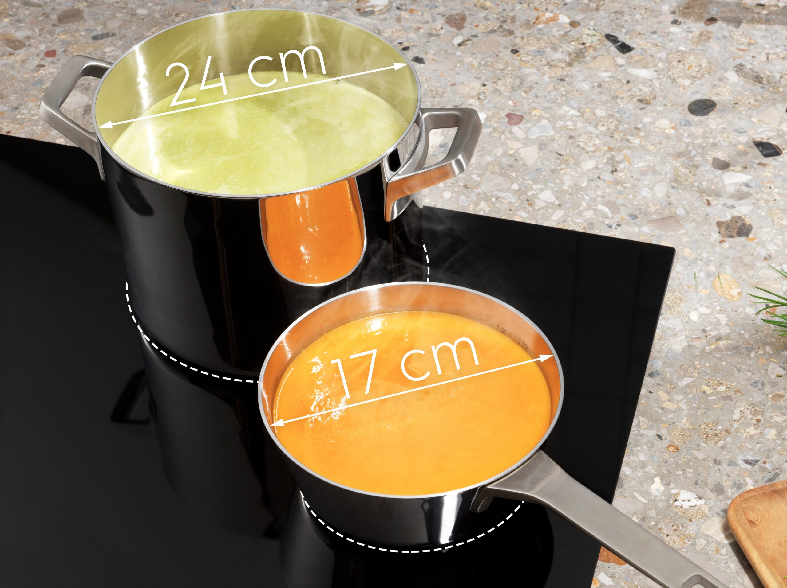 Czy chcielibyście płytę, która automatycznie wykrywa garnki i patelnie? Nie ma problemu! Czy chcielibyście gotować w garnkach o różnych rozmiarach? Nie ma problemu! Responsywna płyta TotalFlex 800 umożliwia gotowanie prawie w dowolnym miejscu płyty.