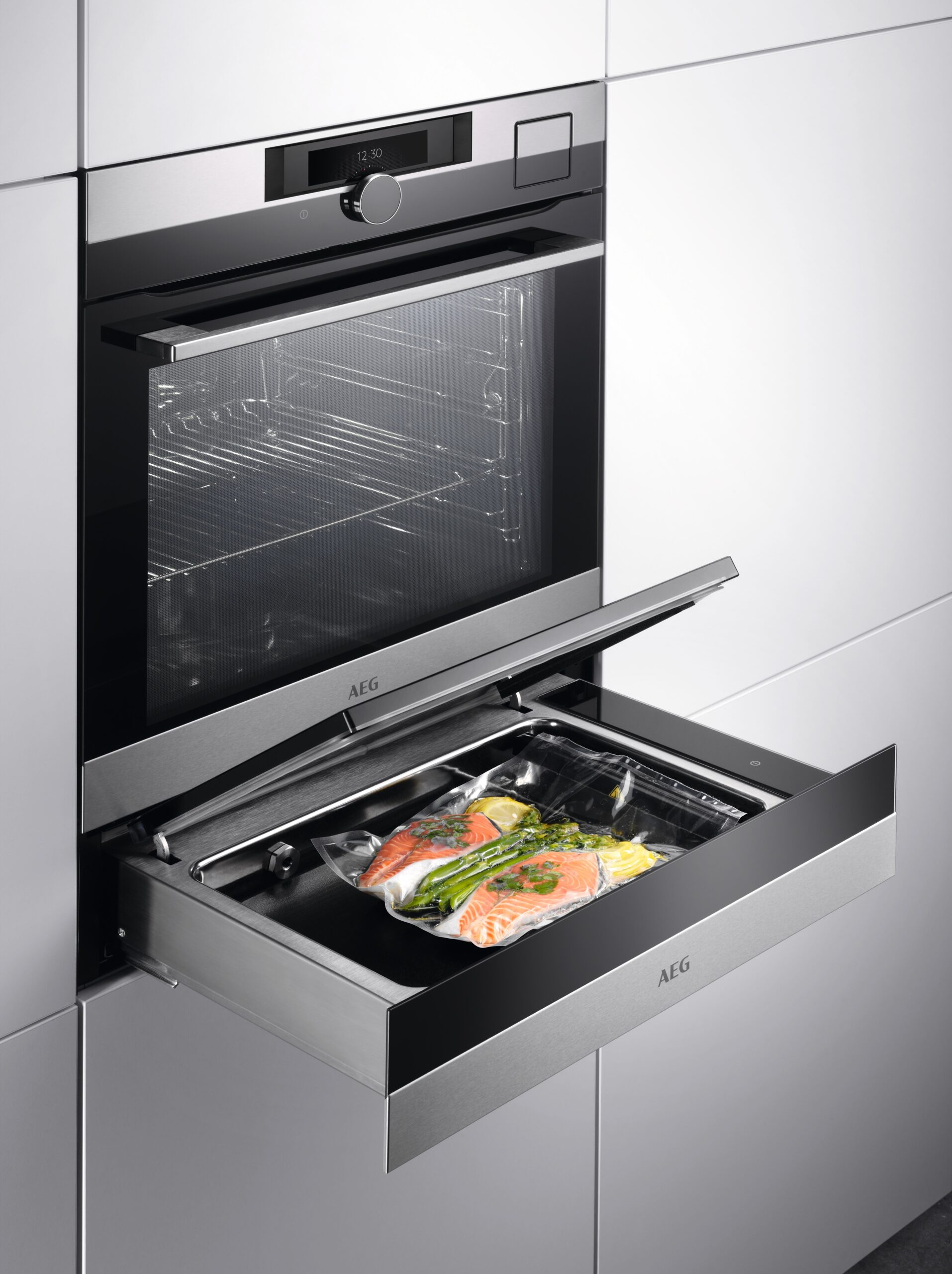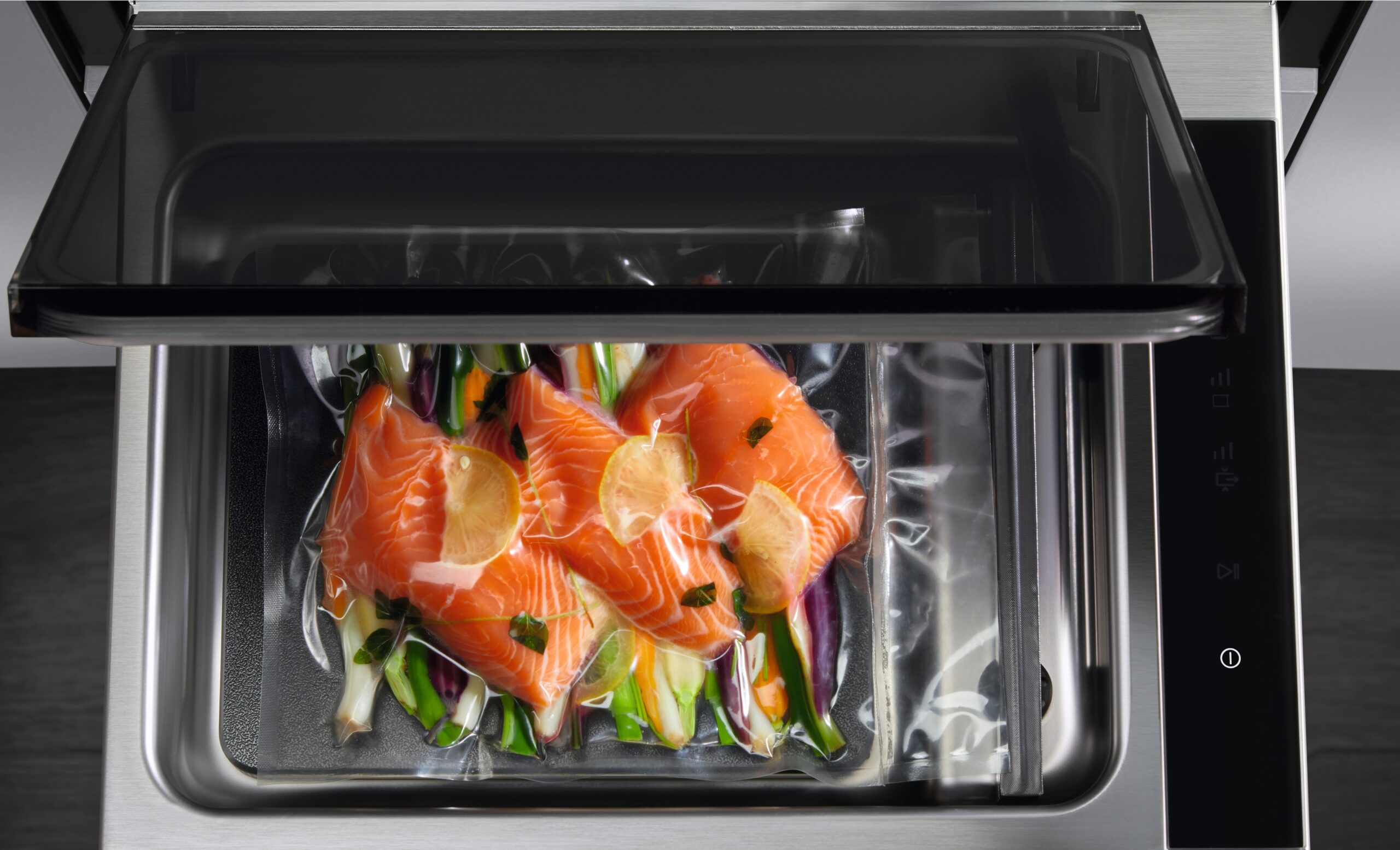 Szuflada do pakowania próżniowego umożliwia profesjonalne zapakowanie żywności we wszystkich standardowych workach spożywczych dostępnych na rynku, zarówno w celu przechowywania, jak i przygotowania w piekarniku SousVide. Całkowite usunięcie powietrza ze środka opakowania pozwala na maksymalne zachowanie wilgoci i przenikanie się smaków podczas gotowania.