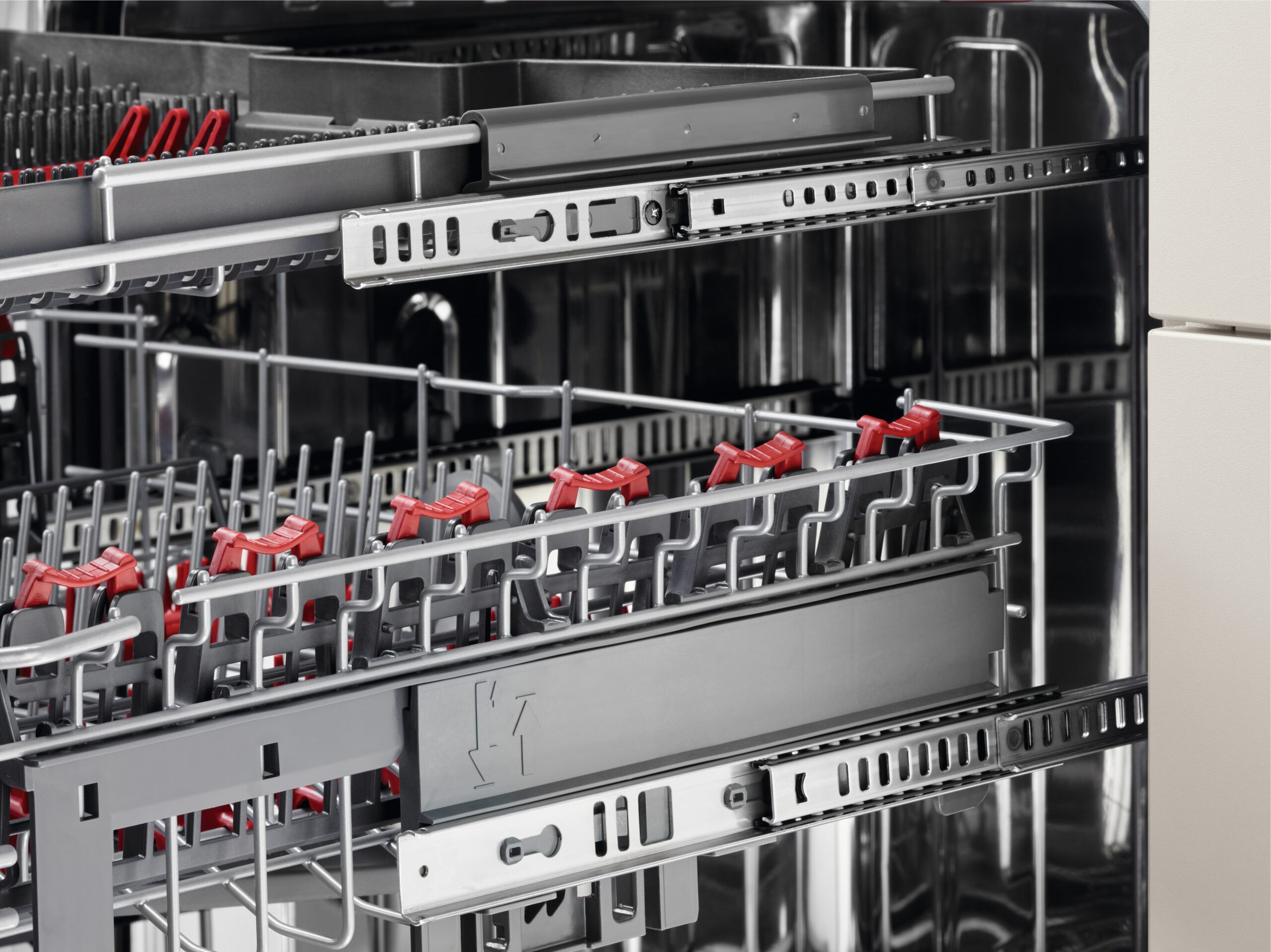 Prowadnice ComfortRails umożliwiają płynne wsunięcie kosza bez towarzyszącego brzęku naczyń. Zawsze płynny załadunek i rozładunek zmywarki. Już nie musisz martwić się o możliwość wyszczerbienia lub pęknięcia naczyń.